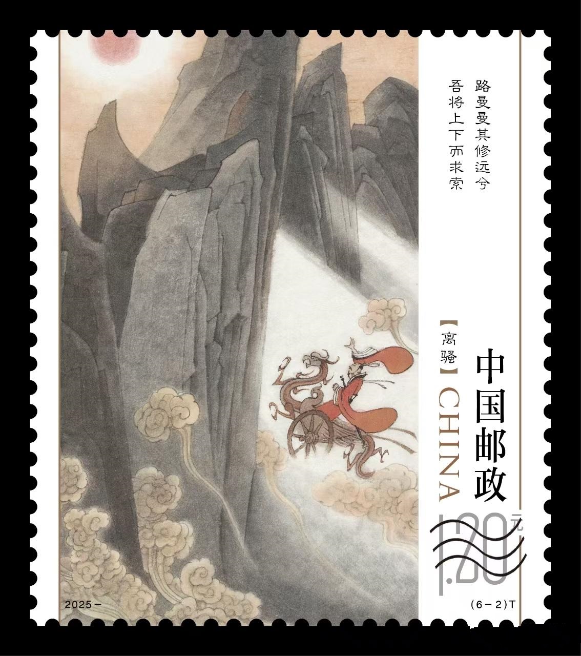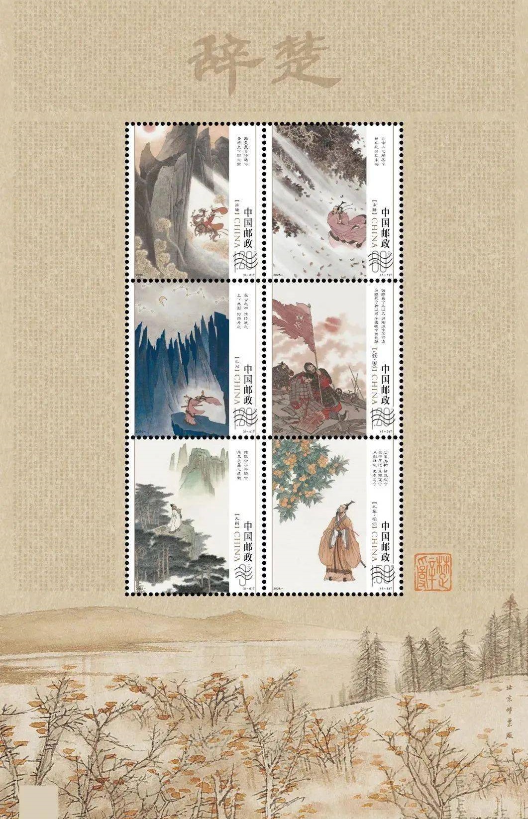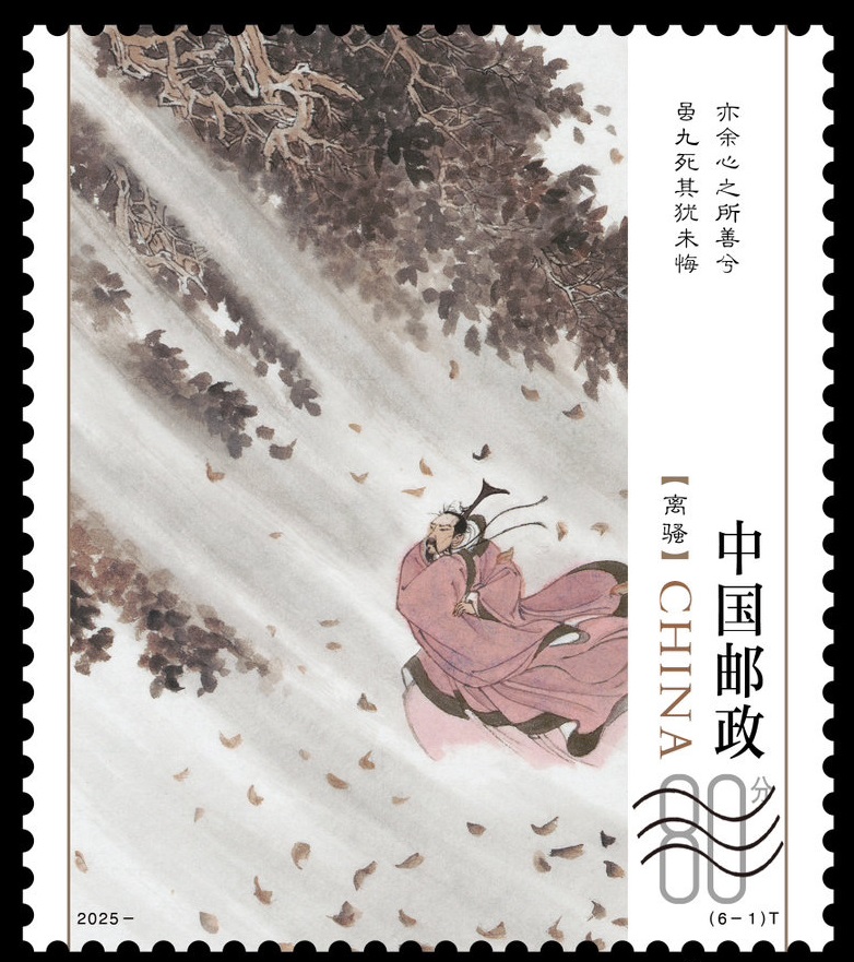 5月31日,《楚辭》特種郵票在武漢首發(fā)。該套郵票從屈原經(jīng)典作品《離騷》《九歌》《天問》《橘頌》中擷取名句,以水墨筆觸勾勒詩人行吟、求索、殉國(guó)等意象——“亦余心之所善兮 雖九死其猶未悔”的赤誠、“路曼曼其修遠(yuǎn)兮 吾將上下而求索”的堅(jiān)毅、“后皇嘉樹,橘徠服兮”的高潔,均通過靈動(dòng)的畫面語言定格,成為荊楚文化鮮活的“流動(dòng)符號(hào)”。全套郵票面值8.90元。