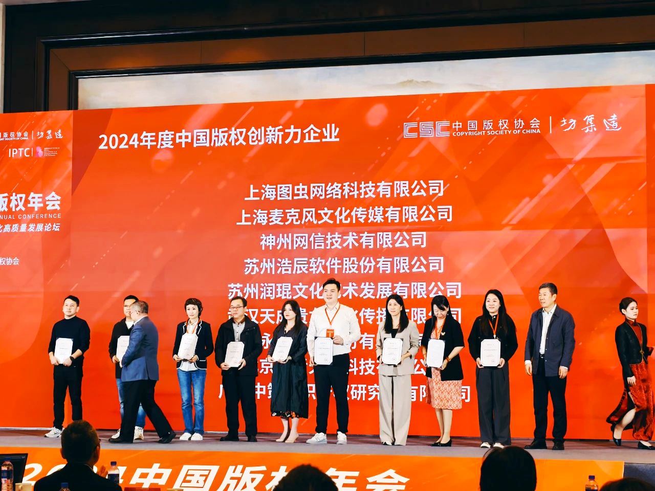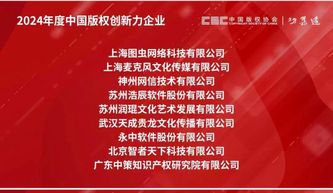 年會公布了2024年度“2024年度中國版權(quán)保護力企業(yè)”“2024年度中國版權(quán)創(chuàng)新力企業(yè)”“2024年度中國版權(quán)影響力企業(yè)”等名單并授牌。其中,武漢天成貴龍文化傳播有限公司榮獲“2024年度中國版權(quán)創(chuàng)新力企業(yè)”榮譽稱號。